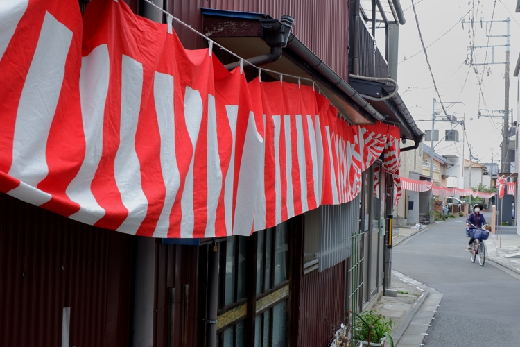 軒端揃え(のきば)。 投稿日: 2024/10/172024/10/17 投稿者: 写真家 丸林正則 昨16日は午後から時間が出来たのでまたまた「川越」まで行くことにしました。いつもは特に目的など無くて場当たり的に被写体を探しているのですが、昨日はこのお祭りのj時期に登場する紅白の幕をメインに写すことにしました。この幕は「軒端揃え」と呼ばれ町の隅から隅まで張り巡らし、その中を聖域とするためのものの様です。 路地にも張られています。 カーブミラーに映った幕。撮影している私も映っています。 張り紙の文が面白かったので。 遠くまで張り巡らされています。 「スタバ」も日本的に。